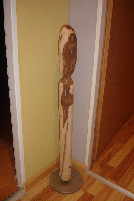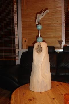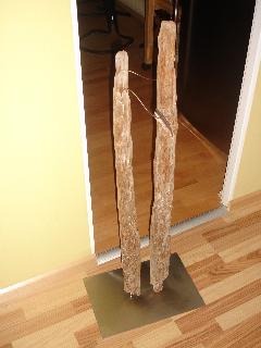 Dies ist eine Buhne vom Ostseestrand, welche von mir einfach auf zwei Edelstahldorne gestellt und mit einem an einem Stahlseil hängenden Keramikfisch geschmückt wurde.